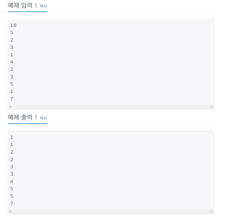 첫째 줄에 수의 개수 N(1 ≤ N ≤ 10,000,000)이 주어진다. 둘째 줄부터 N개의 줄에는 수가 주어진다. 이 수는 10,000보다 작거나 같은 자연수이다.