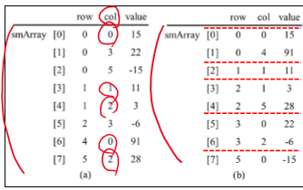 (row)으로 정렬, 행번호가 같을 경우 열(col)을 오름차선으로 정렬. (순서를 꼭 유지해야 함.)