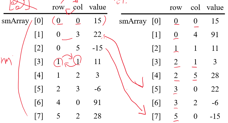 이렇게 원래의 매트릭스에서 해당하는 열을 검색해서 전치 매트릭스로 하나씩 이동시켜주면 됨.