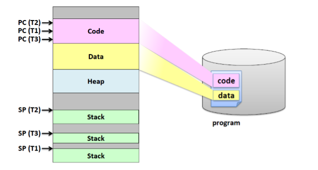 쓰레드들은 스택을 제외한 address space를 공유한다.
