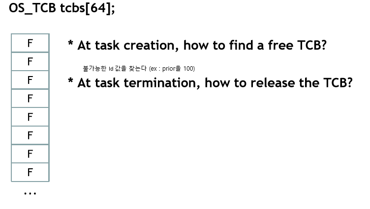 task가 생성이되면 어떻게 free TCB를 찾을까. 불가능한 priority를 가진 TCB를 찾는다.