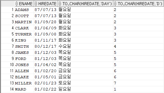 2. 사원명, 입사일 그리고 입사한 요일을 출력하세요. 열 레이블은 DAY 입니다.