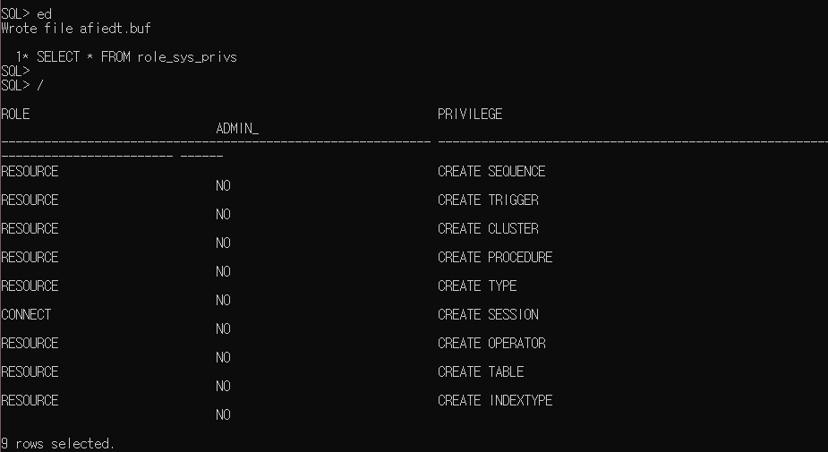 RESOURCE : 자신의 테이블, 시퀀스, 프로시져, 트리거 객체 생성 권한