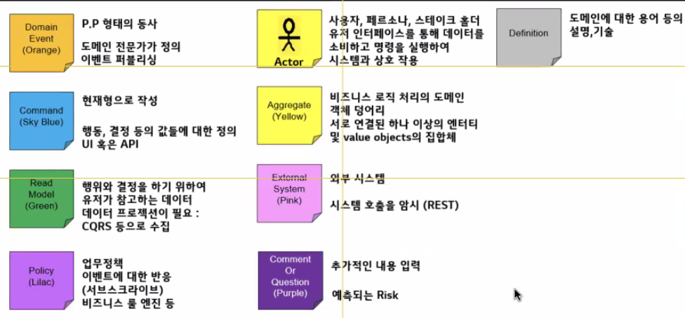 - 이벤트를 사용해서 시스템을 모델링하기 위한 워크샵 및 브레인스토밍 기법 (도메인에 대한 이해가 부족할 경우 다 같이 동기화해서 시작. 현업에서 주로 사용)