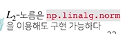 L2 노름을 구할 때는 제곱(x*x)을 해주고 더해주고(np.sum()) 루트(np.sqrt)를 씌워준다.