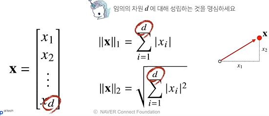 노름이라는 기호는 임의의 차원 d에서 성립함. 차원의 개수와 상관없이 계산을 할 수가 있다.