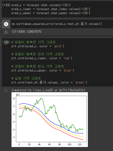 예측값과 실제값의 rmse 값과 그래프를 그려보았다. 128일 정도의 예측을 해서 rmse값이 저 정도 인데 날짜를 줄이면 획기적으로 줄어들 것이다.