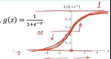 x가 양수일 때는 0.5이상의 값. 음수일 때는 0.5이하의 값. x의 값이 커질 수록 y값도 커짐.