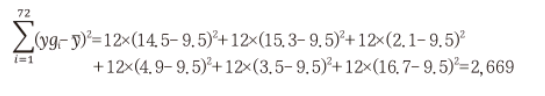 각 데이터에 9.5 (데이터의 평균)을 빼주고 제곱을 해준 뒤, 모두 더해주면 3684라는 숫자가 나온다. 여기서 (72(모든 데이터의 개수) - 1)를 나눠주면 51.9가 나온다.
