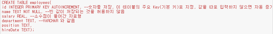 이런 식으로 """ """ 안에다 sql문을 넣어준다. employees라는 테이블을 만들도록 하겠다.