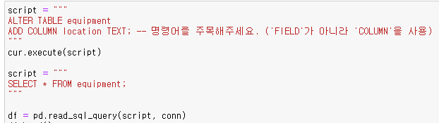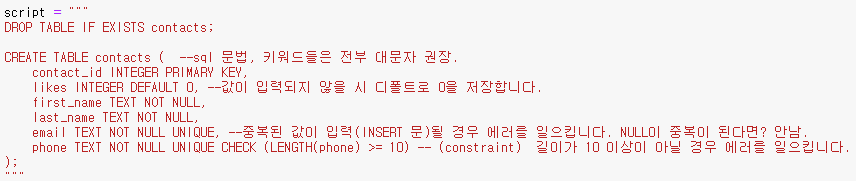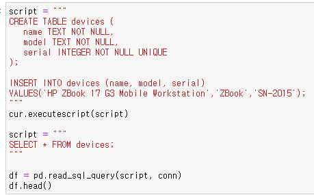 우리는 script라는 문자열안에다 sql문을 넣고 위 execute함수를 사용해 연결된 DB에 명령을 내릴 것이다.