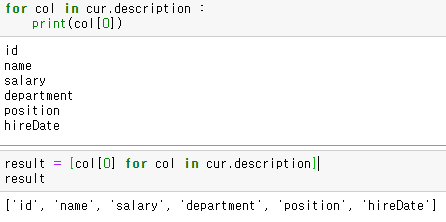 description을 사용하면 지금 커서가 위치한 테이블이 모두 어떤 열을 가지고 있는 지 알 수 있다.