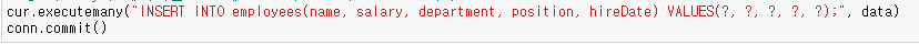 커서를 이용해 executemany를 이용하면 한 sql문을 여러번 사용할 수 있다. INSERT INTO 테이블명(인자)를 사용하면 된다. VALUES()안에 두 번째 인자인 리스트가 들어간다.