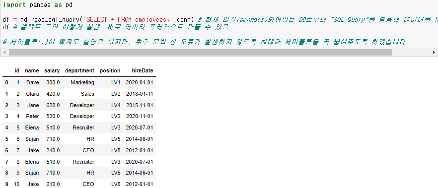 우리가 주로 쓸 SELECT 문이다. "SELECT * FROM employees;"의 서순을 보자면 "* 열을 가져온다. employees라는 TABLE로부터" 로 해석하면 된다. *는 모든 열을 의미한다. 이렇게 SELECT문을 사용하면 cur 객체가 해당하는 데이터를 가리키게 된다. 이때 우리는 fetchall()을 사용하면 된다.