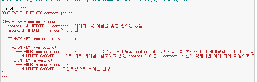 여기서 FOREIGN KEY는 처음 보는 것인데 CREATE에서 쓰이는 이 것의 의미는 해당 테이블에서 가져온 값이라는 것이다. 그래서 나는 처음에 contact TABLE에서 추가를 하면 이 TABLE에서도 그 값을 가져와 자동으로 추가시켜주는 줄 알았는데, 그게 아니라 이것을 정의해주는 이유가 contact 테이블에 있는 contact_id 값과 contact_groups의 contact_id 값이 명시적으로 같은 값이다라는 것을 보여주는 것이다. 또한 이렇게 연결 지어줄 경우 entity 즉 다른 개체, TABLE의 해당 값이 삭제될 경우 여기에 저장된 값도 삭제할 수 있는 설정을 추가할 수 있다.