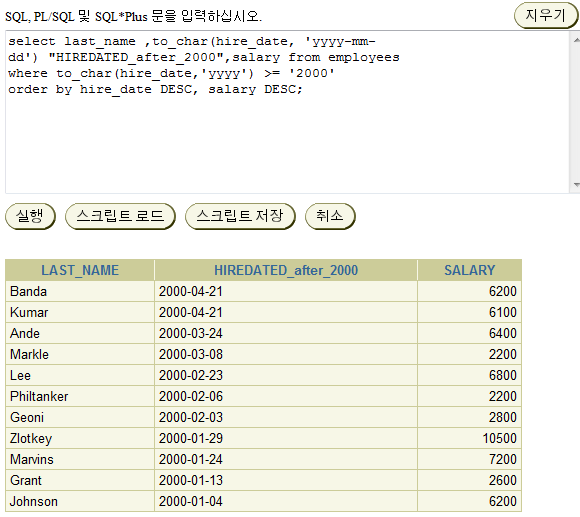 데이터를 정렬할 수 있다.디폴트는 오름차순 정렬. 내림차순 정렬은 DESC를 붙이면 된다.