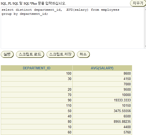 부서 id의 유일한 값을 보고 싶다면 위와 같이 distinct 키워드를 입력한다.