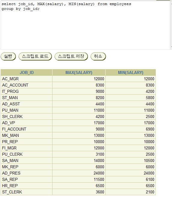 group by는 특정한 쿼리 조건으로 데이터를 그룹화할 때 사용함. 그 그룹에 집합함수를 사용해서 원하는 결과를 얻을 수 있다. (집합함수 : AVG(),SUM(),MIN(),MAX())