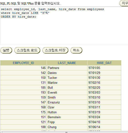 고용된 날짜가 97년도인 사원들을 고용된 날짜를 기준으로 오름차순으로 정렬.